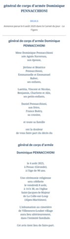 Le général de corps d'armée Dominique Pennacchioni passe dans la deuxième section des officiers généraux à la fin août 1994. Il était officier de la Légion d'honneur, commandeur de l'ordre national du mérite et titulaire de décorations étrangères.