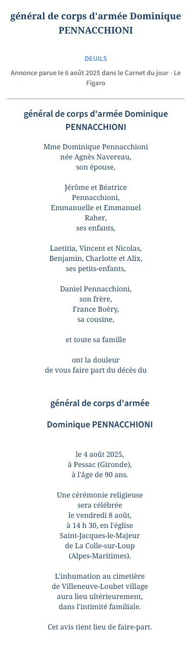 Le général de corps d'armée Dominique Pennacchioni passe dans la deuxième section des officiers généraux à la fin août 1994. Il était officier de la Légion d'honneur, commandeur de l'ordre national du mérite et titulaire de décorations étrangères.